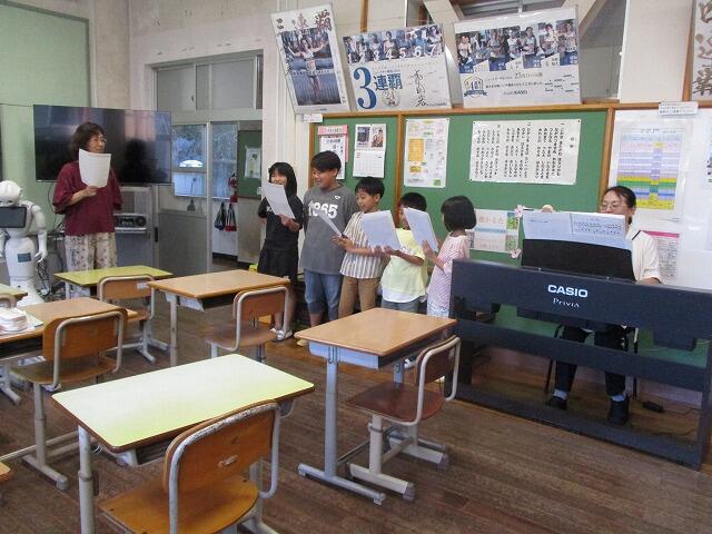 ↓3・4年生です。毎日の帰りの会で、先生の伴奏に合わせて校歌を歌っています。