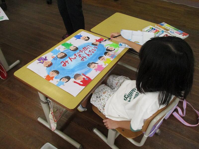 1・2年生の図工の時間です。人権に関する絵の仕上げをしていました。絵の具での色ぬりも慣れてきました。みんなが仲良くなれそうなポスターです!