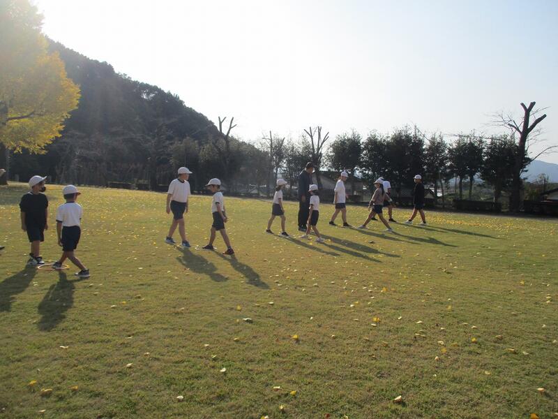 11月13日、雨降りの1日でした。そこで、昼休みは、体育館で仲良く遊んでいました。特に、『線おに』という線の上を逃げたり追いかけたりするおにごっこで盛り上がっていました。線の上を意識して俊敏な動きができ、いい運動になりました。