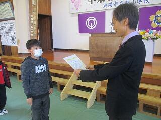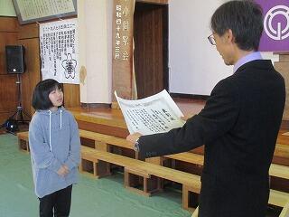 その後、校長先生のお話、代表生徒の作文発表、各種表彰、春休みの過ごし方について先生方のお話が行われました。