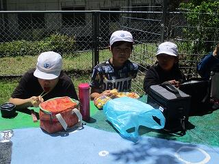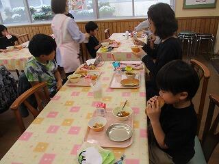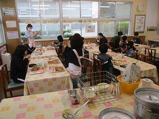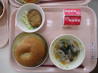 メニューは、『てりやきチキンハンバーガー・ゆで野菜・野菜と春雨スープ』でした。マヨネーズで味付けがしてあるゆで野菜が、てりやきチキンとぴったり合って、おいしいハンバーガーでした。子どもたちは、うれしそうに食べていました。いつもより早めに食べ終わったようです。