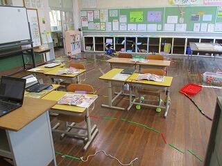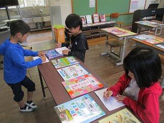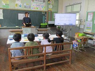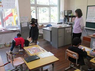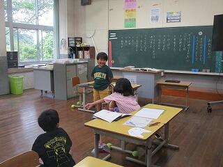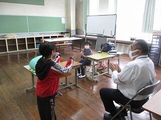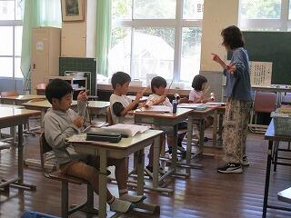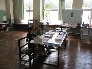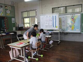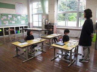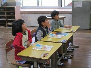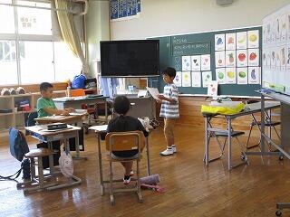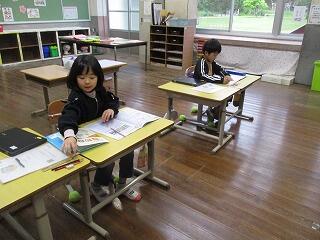 1・2年生の授業です。1・2年学級、3名がそろいました!2名の2年生もうれしそうです。生活科で、さっそく「学校探検」の計画を立てました。なかよくお勉強をしました。