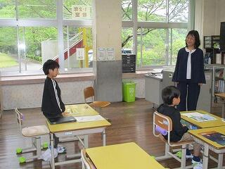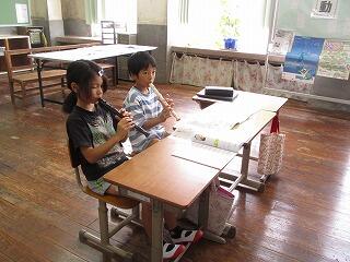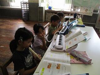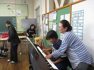 5・6年学級の放課後の様子です。先生から、校歌の伴奏を教えてもらっています。今日は、二人で校歌を弾きました。両手で伴奏することができるようにがんばっています。