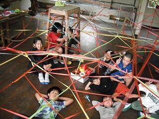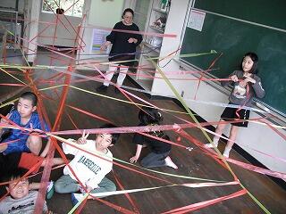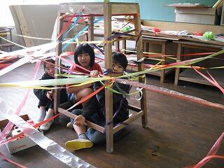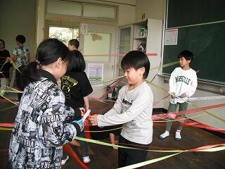 その後、「ひもをつなげて」という単元で、図工室中をひもだらけにしました。