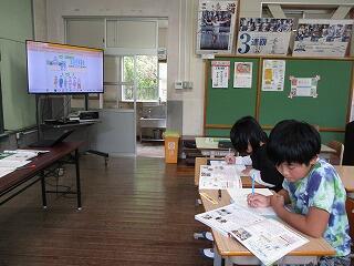 1・2年生の国語です。作文発表を行いました。島野浦学園の2年生もオンラインで参加して、一緒に発表会をしました。お互いに、質問したり感想を発表し合ったりしました。
