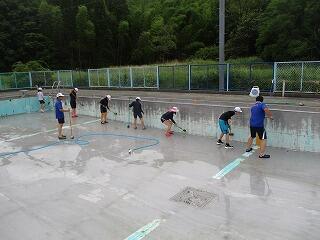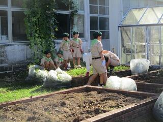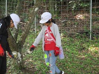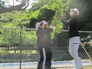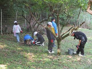 運動場のトラック整備、花壇の整備、草刈り、木の剪定、池の整備、溝掃除、落ち葉掃きなどの作業をしていただき、校庭や学校のまわりが大変きれいになりました。子どもたちは、みどりの少年団の制服を着て作業に取り組みました。