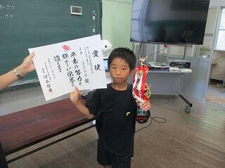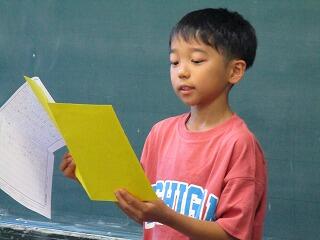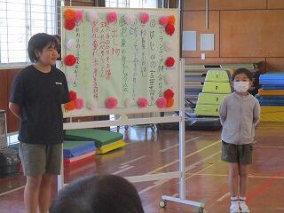 始業式では、5年生の代表児童が2学期にがんばりたいことを発表しました。みんなの前で堂々と話す姿に大きな拍手が送られました。また、夏休み中にがんばった少年団等の表彰も行いました。