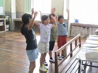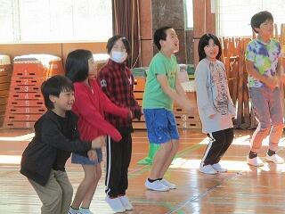 1~4年生の音楽「かもつ列車」です。楽しく仲良く、列車になって歌いました。