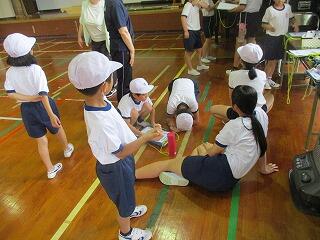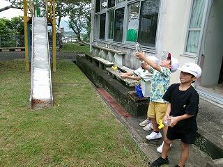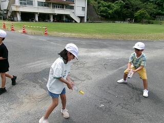 7月10日、1・2年生の生活科で「なつのあそびをしよう」の学習がありました。ペットボトルに水を入れて、どこまで水がとぶか競争したり、水でアスファルトにお絵かきをしたりして、楽しみました。久しぶりに外遊びができ、うれしそうな子どもたちでした。夏の楽しい遊びもたくさん味わってほしいです。