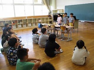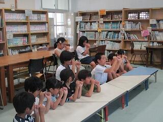 7月23日(火)、今朝は、今年度2回目の読み聞かせがありました。今回も、読み聞かせボランティアの田崎さんと富髙さんが読み聞かせに来てくださいました。