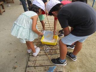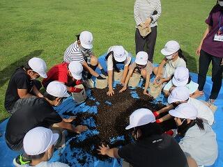 3、4年生が算数の時間に運動場の砂を使って重さの学習をしていました。