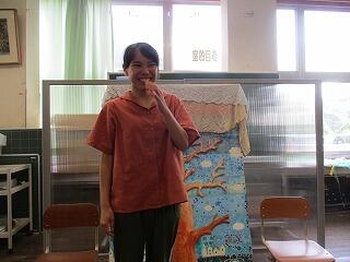 3校時に合同学活で「歯を大切にしよう」というテーマで養護教諭の田中先生に正しい歯の磨き方を教えていただきました。