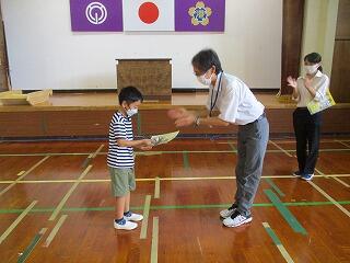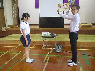 その後、保健関係の表彰を校長先生からしていただき、最後は全員でスマイル、チャレンジ、港パワーを全身で表現しました。
