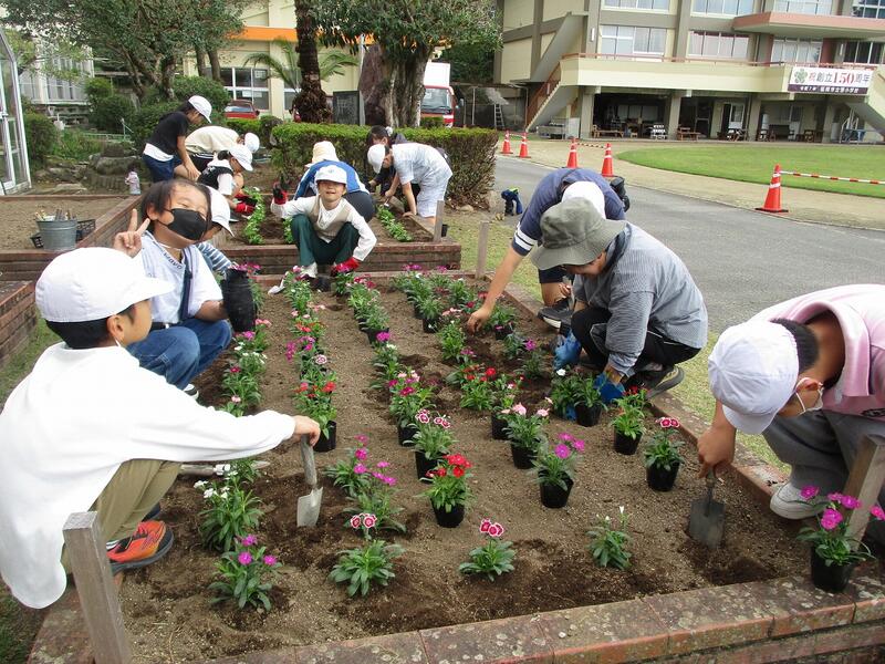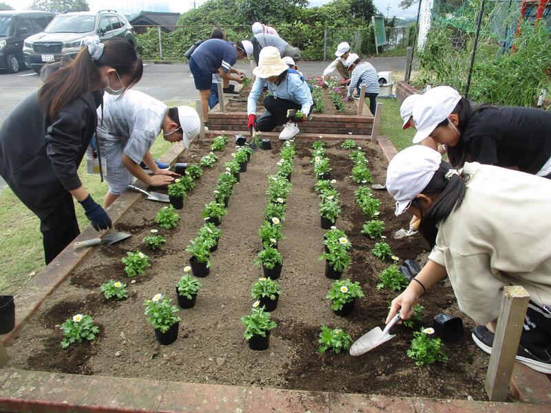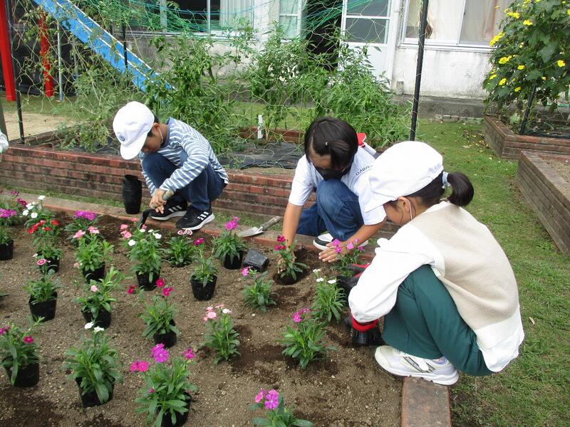 10月27日『グリーンタイム』の時間に、春に向けて学校の花壇に花の苗を植えました。ノースポールとナデシコです。子どもたちは、どんぐり班に分かれて、それぞれ60本の苗を植えました。春には、お花がモリモリ咲きそうです。どんぐり班でお世話をがんばっていきます!