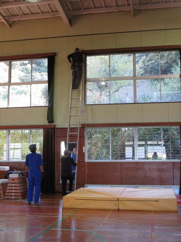 10月28日、150周年実行委員会の方が、体育館にスクリーン設置をするための準備をしてくださいました。高いところでの作業でしたので、大変だったかと思います。安全に作業していただき、ありがとうございました。来週は、スクリーンを設置してスライドショー『東海・港小の歴史』のリハーサルが予定されています。