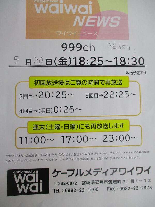 梅ちぎりの様子は、本日付(18日付)の夕刊デイリーに掲載されています。また、ケーブルメディアワイワイでも放送される予定です。