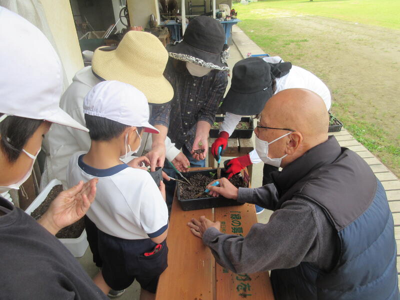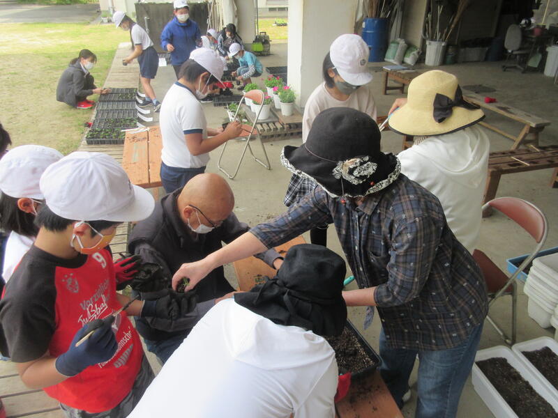顔合わせ会の後、4名の方にご協力いただいて「花いっぱい活動」を行いました。4月に種をまいた「マリーゴールド」「サルビア」「インパチェンス」が発芽し本葉が出たので黒ポットに植え替えました。小さな苗を一つ一つていねいに植え替えていきました。次回はさらに大きくなったものを花壇へと植えていく予定です。