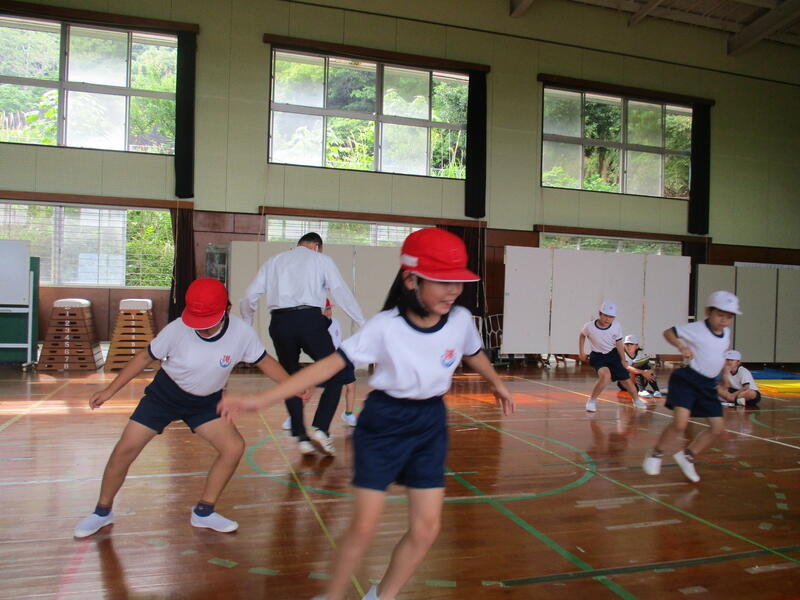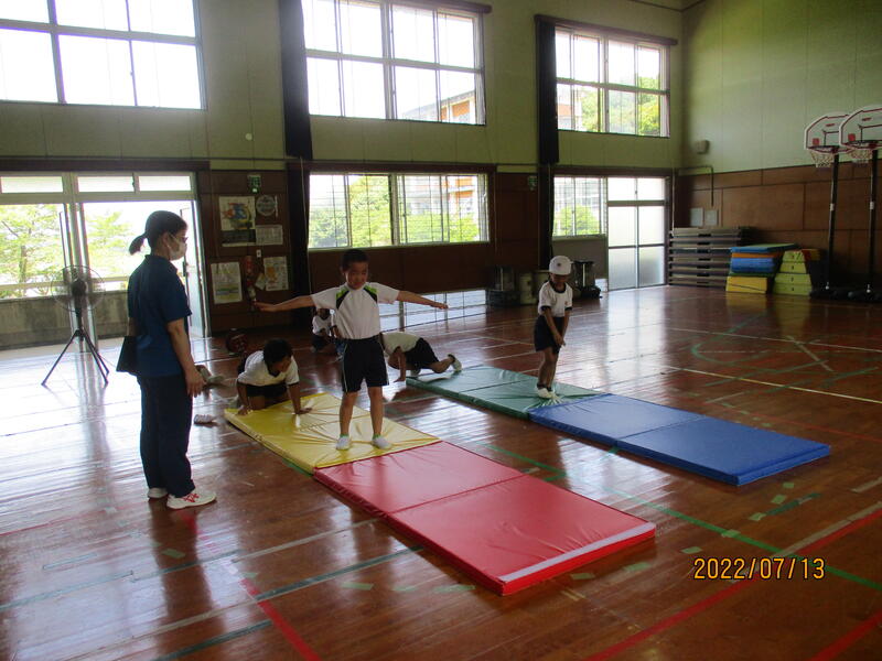 本日の5校時は体育の授業でマット運動を行いました。1~3年生は前転を、4~6年生は後転や側転の練習をしました。体を丸くして回転しないといけないので柔軟性が必要となってきます。回転の様子をタブレットパソコンに動画で撮って自分の動きを確かめていました。前転や後転につながる動きをスモールステップで練習し、技の完成に向けて一人一人がんばっていました。