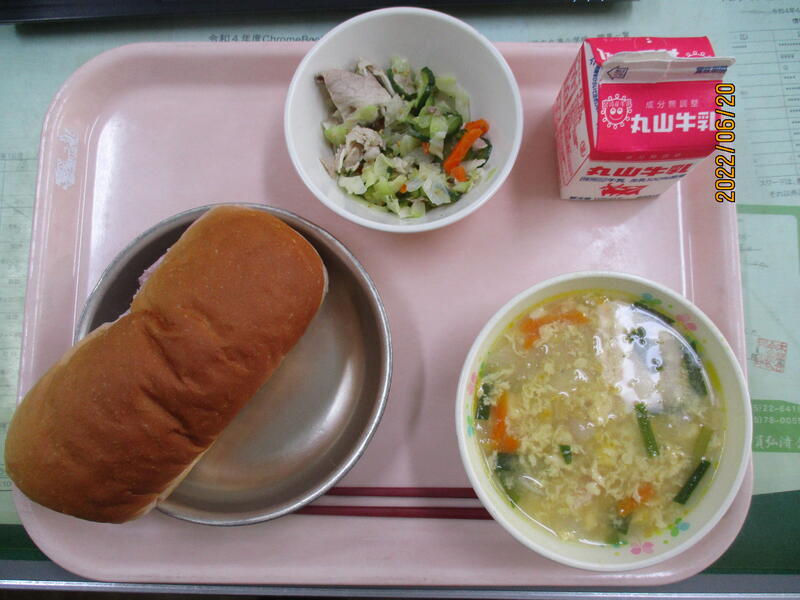 今日の給食は、「ぶたしゃぶサラダ」「中華コーンスープ」「いもっこパン」「牛乳」でした。梅雨に入り、蒸し暑い日が続くようになってきて、食欲が出ないときもあるかと思います。そのような中、熱中症や夏バテしないように十分な栄養補給と睡眠の確保に努めることが大切です。