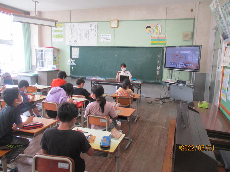毎年6月4日は、「歯と口の健康週間」の始まりの日です。歯と口の健康について、子どもたち一人一人がよく考えられるように「全国はみがき大会」に参加しました。なぜ、歯みがきが大切なのか、大人になっても健康な歯ぐきを保つためには何が必要かについて学びました。また、歯ブラシでの歯みがきだけではプラーク(歯垢)は取りきれないので、デンタルフロス(歯間ブラシ)を使ってきれいにすることが大切だということも学びました。4月の歯科検診でむし歯のあった人は、今日の学習にもあったように、毎食後の歯みがきと早めの治療に心がけましょう。