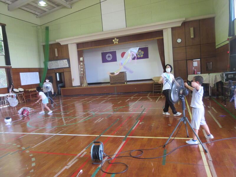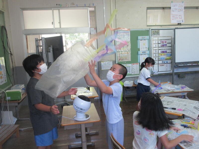 本日、港小学校区に住んでいる 三浦 薫くんが3・4年生と一緒に勉強をしました。図工「ふきあがる風にのせて」でビニール袋に絵を描いたり飾りつけをしたりして作品をつくりました。その後、できあがった袋を扇風機の風を利用して飛ばしました。薫くんも進んで絵を描いたり、風にのせて飛ばしたりとみんなと活動ができてとても楽しかったようです。これからも数回、港小に来て、みんなと勉強をしていく予定です。