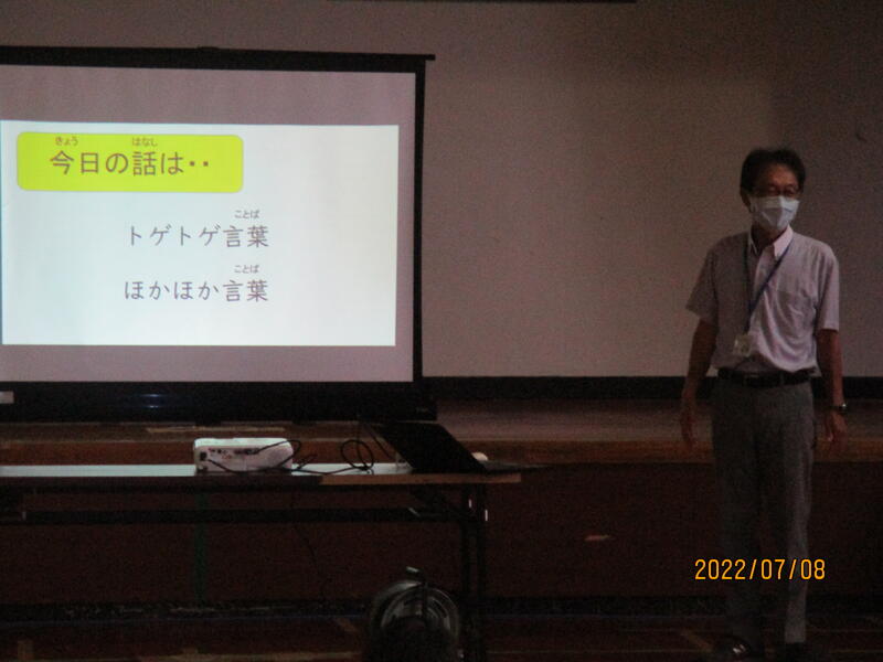 本日の全校朝会では、まず校長先生より「チクチク言葉」と「ホカホカ言葉」の話がありました。友達を悲しくさせたり、いやな気持ちにさせたりする「チクチク言葉」ではなく、友達を楽しくさせたり、うれしい気持ちにさせたりする「ホカホカ言葉」を多く使っていくことがみんなの笑顔につながることを話されました。「ありがとう」「がんばっているね」「ごめんね」などの言葉を学校でも家庭でもたくさん使っていきましょう。