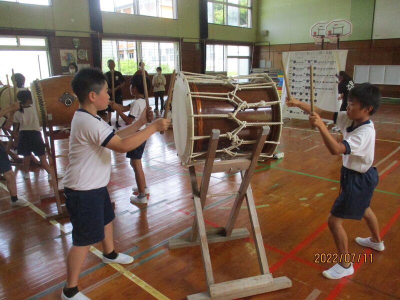 4回目のわんぱく太鼓の練習がありました。雲海太鼓代表の平野勝己さん、洋子さんにお越しいただき、ばんば太鼓についてご教授いただきました。子どもたちも4回目とあって、打ち方だけでなく、姿勢や足の運び方なども上達してきました。運動会前にあと1回練習をして本番を迎えます。