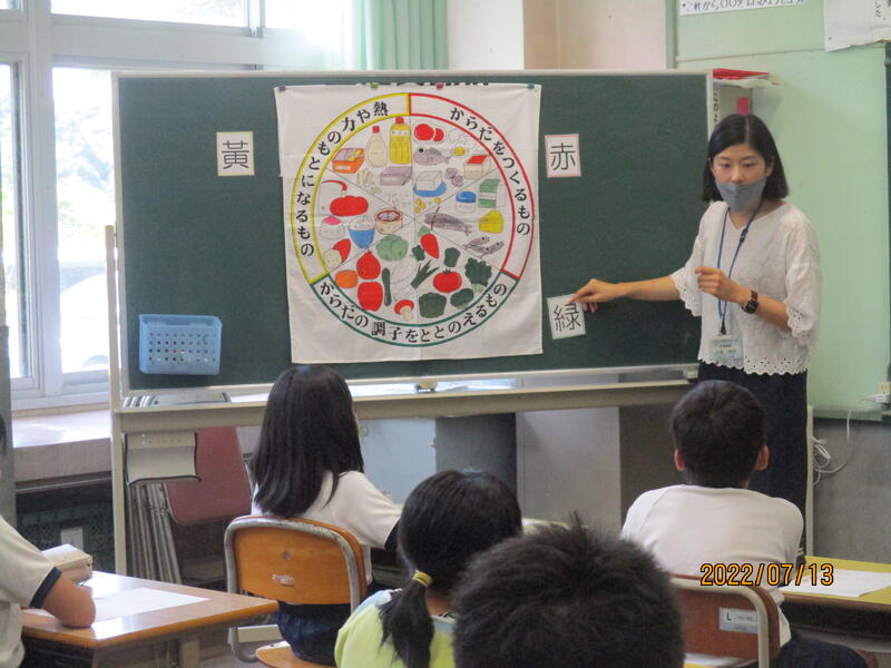 本日、川島小の栄養教諭の土井先生に来ていただき、食育の授業をしていただきました。バランスのよい食事をとることや好き嫌いなく食べることで心も体も健康になることなどを学習しました。毎日の給食では栄養のバランスを考えた献立が出てくるので、家庭でも食事作りの参考にできそうです。