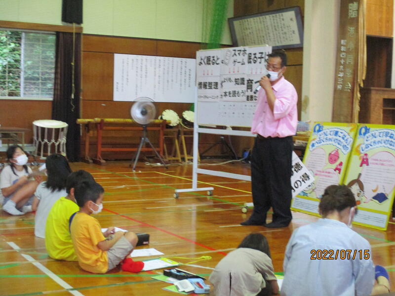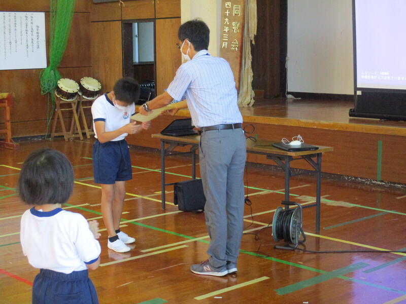 終業式では、校長先生より夏休みに向けて目標を立てて、いろいろなことに挑戦してほしいという話がありました。また、水の事故、交通事故、熱中症・コロナ対策、早寝・早起き・朝ご飯などの生活リズムについても話がありました。さらに夏休みの安全面や保健面、学習面について3名の先生からも話がありました。