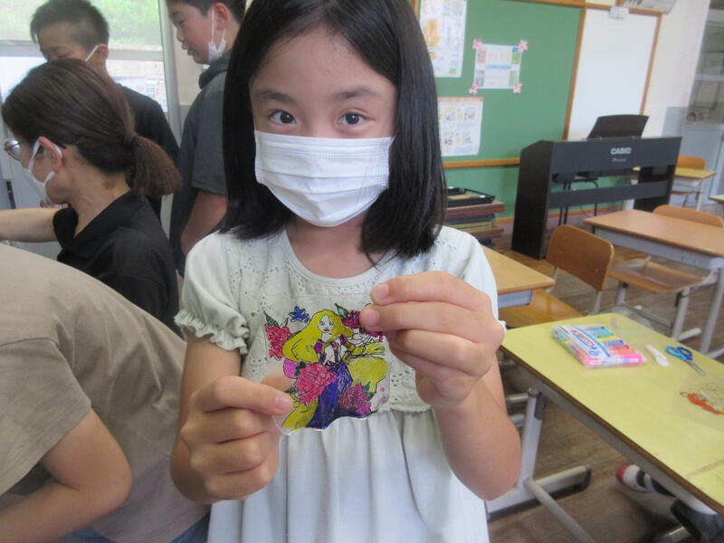 本日のクラブ活動は、前回に引き続きプラ板づくりでした。プラスチック板に好きな絵を描き、それに色付けをして、トースターで熱を加えるとキーホルダーやしおりとして使えます。思い思いの絵を描き終わり、お気に入りのプラ板が完成しました。