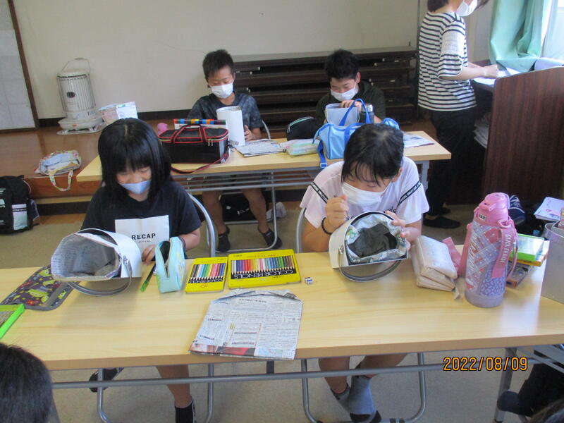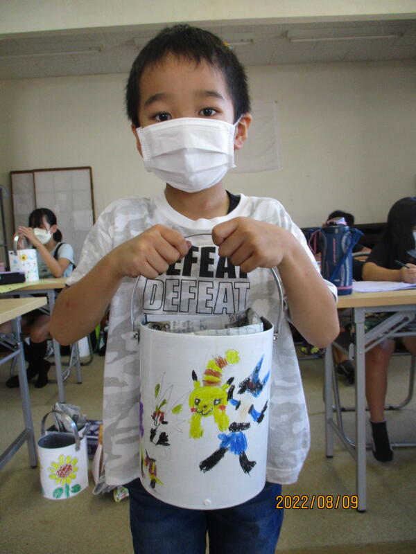 本日の港公民館登校では、夏休みの課題のチェックと環境についての講話を聞きました。環境についての話のあと、新聞紙や広告を使ったゴミ入れ作りを体験し、ブリキ板で作ったゴミ箱に思い思いの絵を描いていきました。捨てればゴミですが、今あるものを有効活用することで少しでもゴミを減らすことにつながることを学びました。講師として来てくださった環境カウンセラーの甲斐勤子さん、ブリキ職人の木村喜久夫さん(いずれも川島町在住)には多くのことを学ばせていただきました。この場を借りてお礼申し上げます。ありがとうございました。