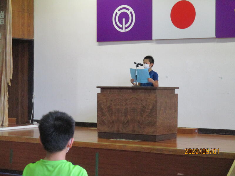 始業式では、6年の渡邉賢士朗くんが「2学期がんばりたいこと」の作文を発表しました。運動会や持久走大会に向けて、これからやるべきことや一つの目標に向かって努力すべきことについての決意が表れていました。