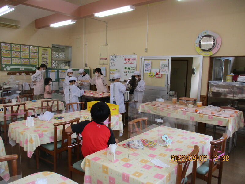 今日から2学期の給食がスタートしました。2学期からは給食の配膳のしかたが少し変わり、感染症や異物混入を防ぐために、お盆の上におかずやご飯などをすべて並べ終わってから個人で自分の給食を取りに行く形になりました。