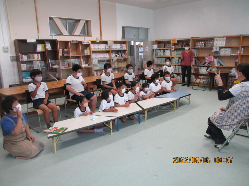 3年ぶりに、読み聞かせボランティアの方による読み聞かせを行いました。ボランティアの喜多俊子さんからはアンパンマン体操や「せんたくかあちゃん」の読み聞かせを、田崎より子さんからは「三匹のぶたの話」「ながーいおはなのブタくん」の読み聞かせをしていただきました。子どもたちも久しぶりの読み聞かせにとてもおもしろかったと笑顔になっていました。学校図書館にはない絵本の読み聞かせだったので、新鮮な気持ちで聞くことができました。