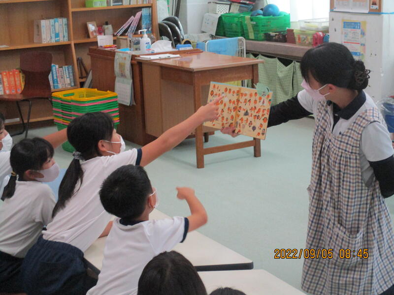 喜多さんからは「おつきみ うさぎ」と「よーい どん!」、田崎さんからは「トカゲのともだち」というお話を聞かせていただきました。季節や行事に合わせた話や友達との関わり方に関するものなど、いつも子どもたちのことを考えた本を選んでくださっています。子どもたちも食い入るように話を聞いていました。