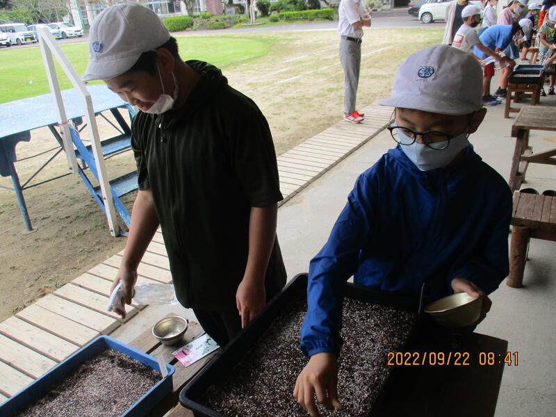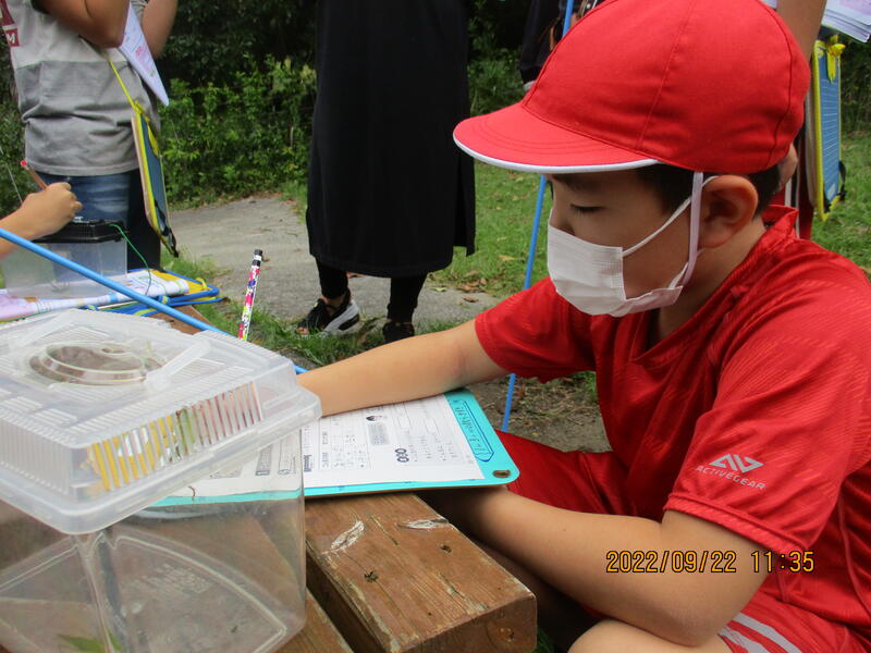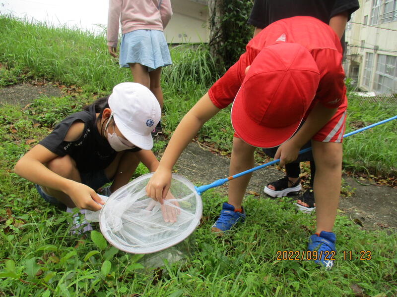 3校時の理科では秋の虫探しを行いました。バッタやキリギリスなどの昆虫をつかまえて、じっくり観察することができました。