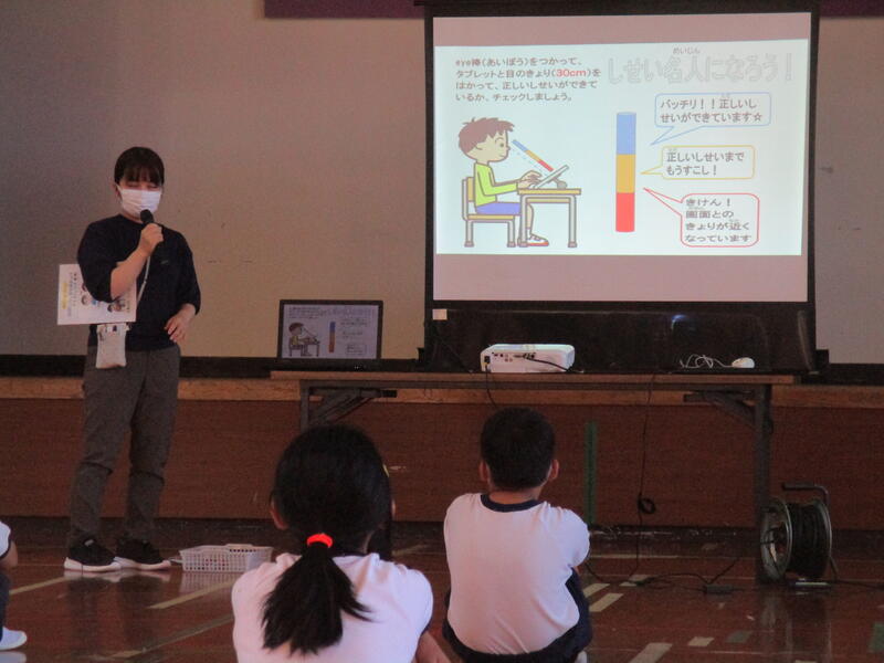 養護教諭の田中先生からは目の健康についての話がありました。「タブレットを使用する際は30㎝はなす」「30分使ったら目を休める」「遠くを眺める」など具体的に話をしていただきました。