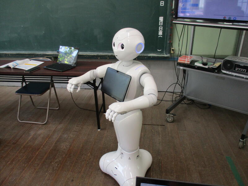 ペッパーくんは、パソコンでプログラムを打ち込んで、言葉をしゃべったり、体を動かしたりするロボットです。今日は5年生以下の子どもたちが簡単なプログラムを組んでペッパーくんを動かしていました。これから3ヶ月間、いろいろなプログラムを組んで、ペッパーくんと交流をしていきます。