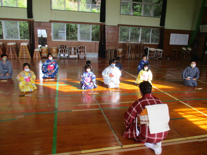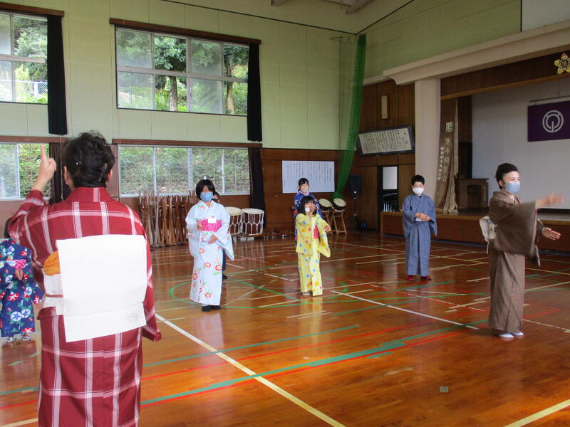 昨年度に続き、花柳慶次松先生をはじめ、3名の方々に来ていただいて「もちづくし」という演目を練習しました。子どもたちは覚えが早く、第1回目の練習で流暢に踊ることができていました。