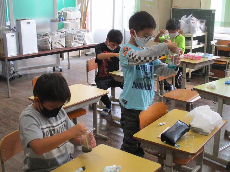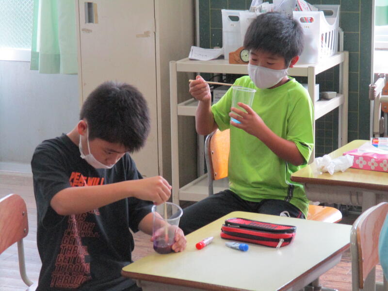 本日、クラブ活動でスライムをつくりました。ホウ砂や洗濯のりを使って自分の好きな色を混ぜて作りました。子どもたちは、できあがったスライムを手で触ったり、みんなと見せ合ったりして楽しんでいました。