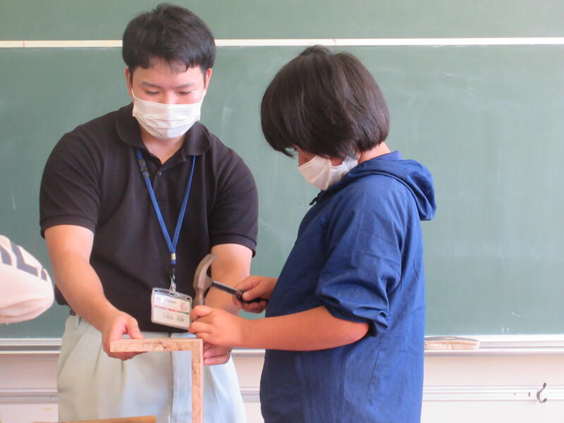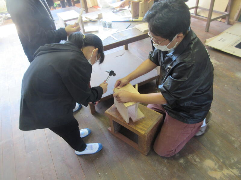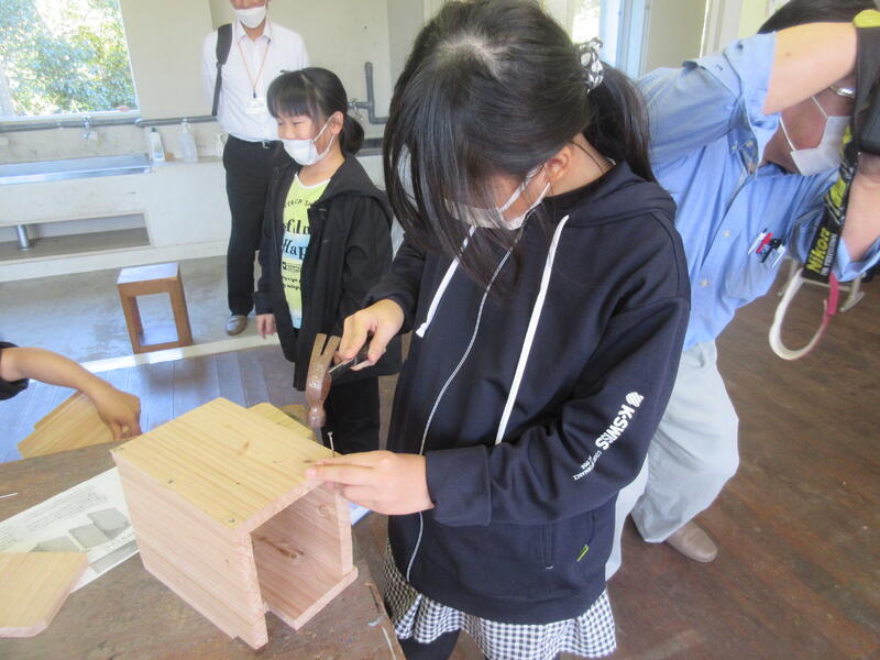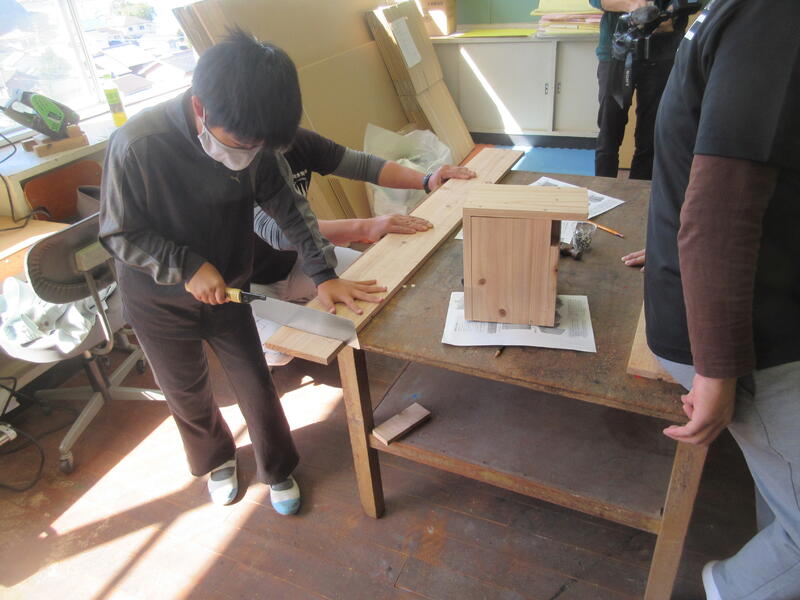 本日、延岡木青会の伊藤信行さんをはじめ3名の方に来ていただいて、森林のはたらきについての話を聞きました。その後、野鳥たちの憩いの場になるように、2時間かけて巣箱作りをし、学校裏山の一字山に設置しました。