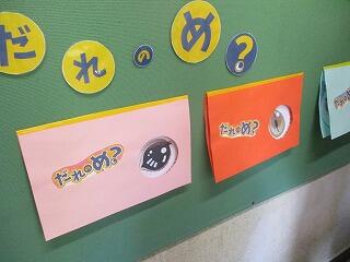 保健室の田中先生が、この間の砂糖が見える自動販売機の掲示を取り外し、目の愛護デーにちなんだ「だれの目?」と言う掲示物にはり替えています。穴からのぞく目が何の動物の目か、開くと答えが分かるようになっています。早速集まってきた人達が答えを言い合っているところでした。