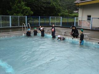 小雨の降る中のプール開きになりましたが、子どもたちは、楽しく水遊びをしたり、一生懸命バタ足やクロールの練習をしたりと、充実した時間になりました。