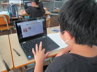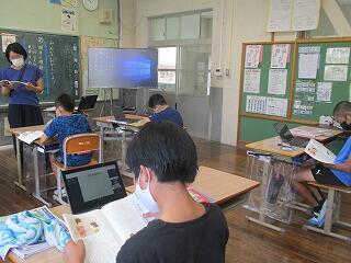 5・6年生は、道徳でタブレットを使いました。それぞれの考えがロイロノートを通してテレビ画面やお互いのタブレットに映し出され、それをもとに話し合いを進めました。