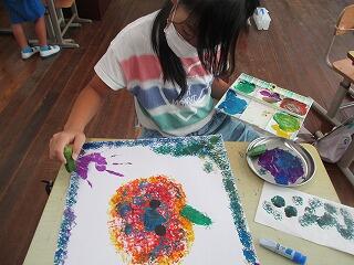 2年生は、ピーマンやオクラをスタンプにしてデザインを描きました。色や形を楽しんでいました。3年生は、算数でタブレットを使いました。コンパスで描いた円をタブレットで写真に撮ってロイロノートに読み込んでいました。