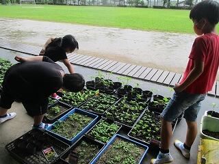 雨の金曜日。2校時、3年生は5月21日にポットに植え替えた苗を観察しました。教室ではアオムシの観察もしました。