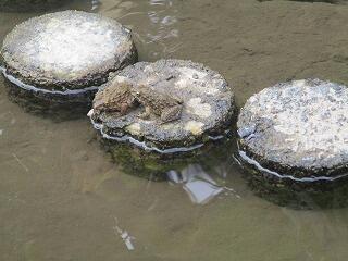 先日、校舎裏のビオトープの池にカエルが2匹いました。以前、水草のホテイアオイに乗っていたカエルかと思われます。朝見かけて1日中動かず、ずっと同じ場所で寄り添っていました。