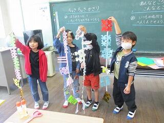 今日の図工は、はさみを使って飾り作りをしました。下学年は、『ちょきちょき飾り』で、はさみを使っていろいろな形を切り取り、紙テープに貼って完成させました。上学年は、『あんなところがこんなところに』でした。作った飾りで、いつもの場所を違う場所に変身させる活動でした。友だちと話し合ったり、先生に質問したりしながら、アイデアいっぱいに楽しく作ることができました。完成後は、お互いに発表をして認め合いました。