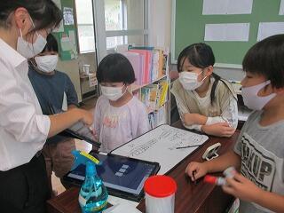 今日は、1・2年算数科の研究授業を担任の阪本先生が行いました。1年生は「たし算(2)」2年生は「図をつかって考えよう」という学習です。複式指導のため、先生が2つの学年を行き来して指導します。ブロックを使って操作活動をしたり、司会者を決めて自分達で学習を進めたり、タブレットのヒントを通して考えをボードに書いたりする姿が見られました。