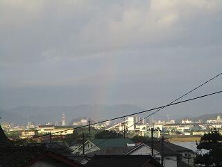 今日雨上がりの朝、学校から見える延岡の町に写真では分かりづらいのですが、縦に虹が架かっていました。晴れるかなと思ったら、その後だんだん雲がかかってきました。
